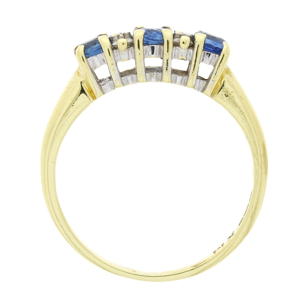 We have for sale a classic pre owned ladies 18ct yellow gold sapphire and diamond dress ring. This beautiful ring features 3 graduated light blue sapphire stones, with the centre stone being oval and having a length of 4.1mm. They are complimeted by 4 small round cut diamonds, and all are claw set. The diamond carat weight for this ring is 0.10cts, with the diamond colour being G, and the diamond clarity being SI1. The solid plain yellow gold band measures 2.2mm at the back.