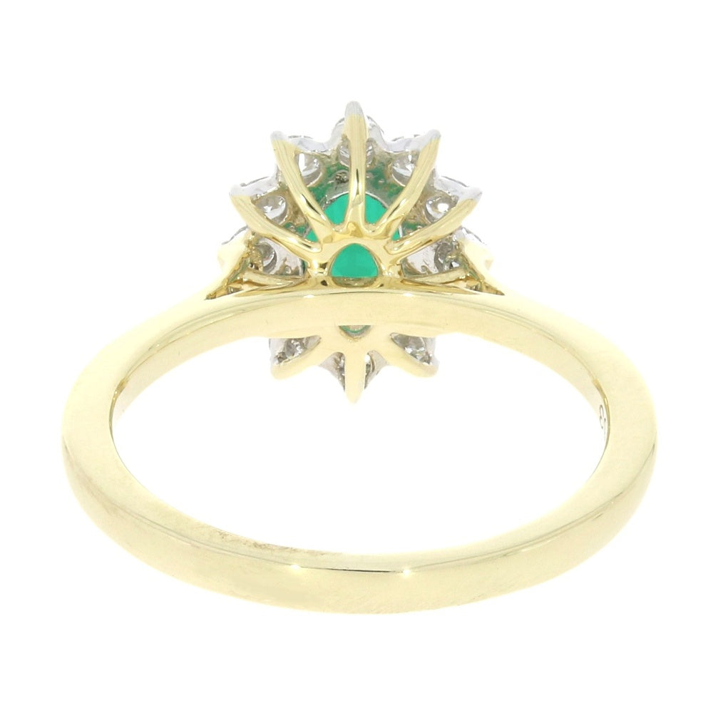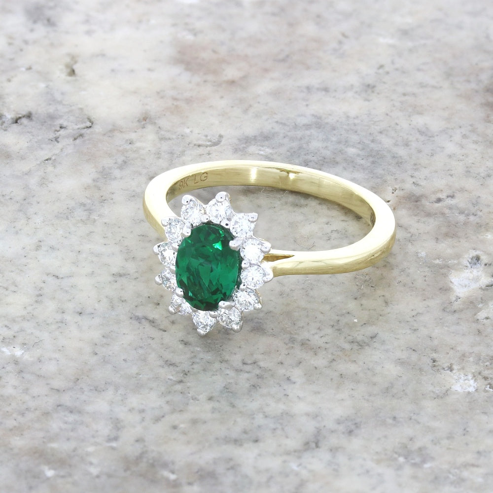 Stunning 9ct gold lab-grown emerald and diamond cluster ring. Featuring a centre lab-grown oval cut 0.71ct emerald, with a surround of 12 brilliant cut Lab-created diamonds, all in a white gold tipped claw settings. The total diamond carat weight for this ring is 0.36cts, with a diamond colour grade of F, and a diamond clarity of VS 2.