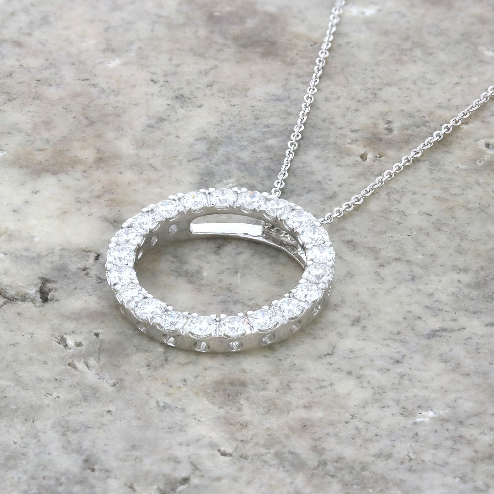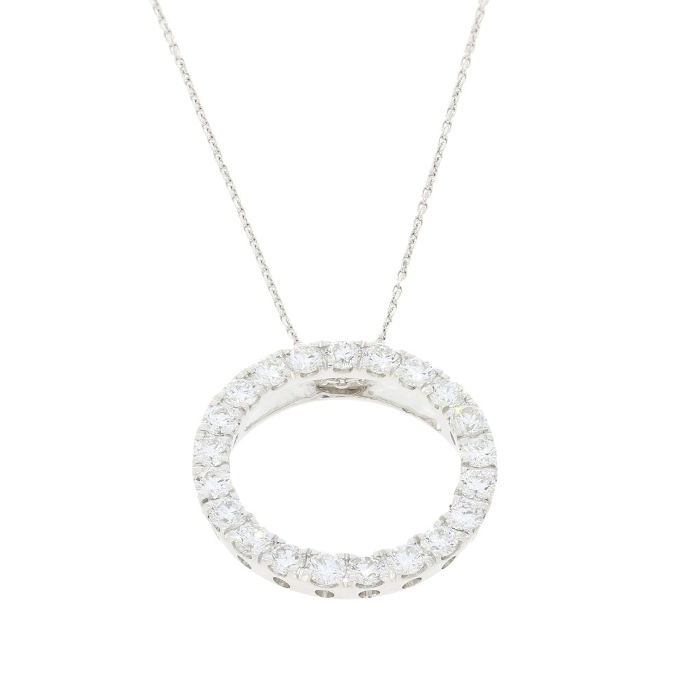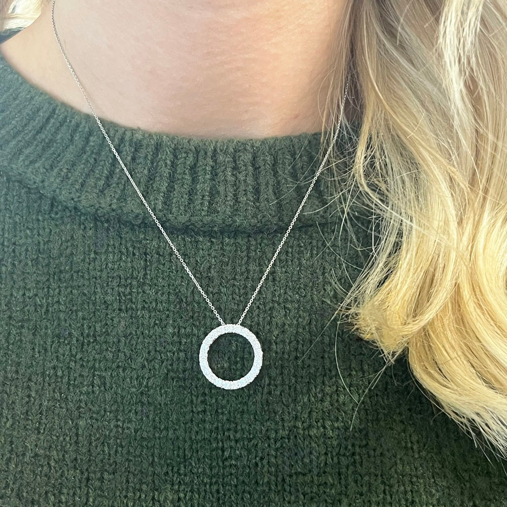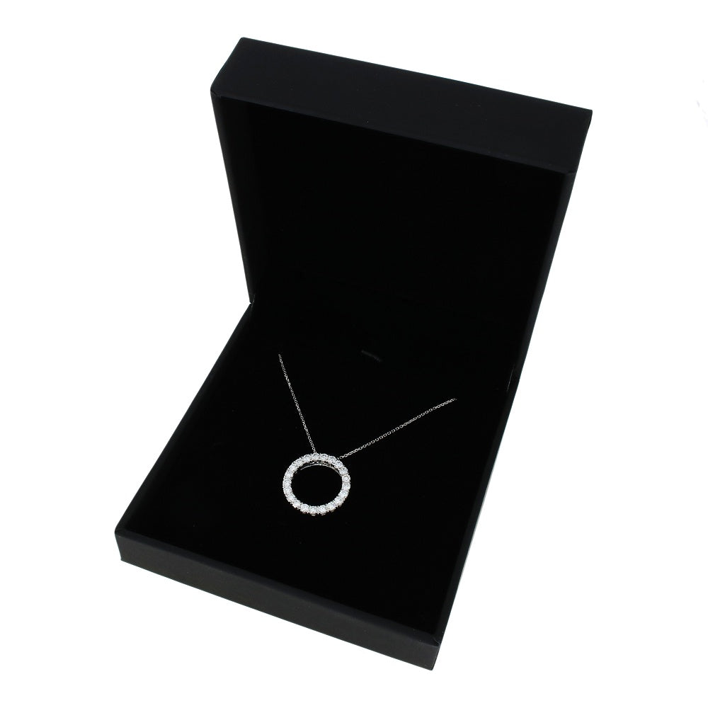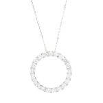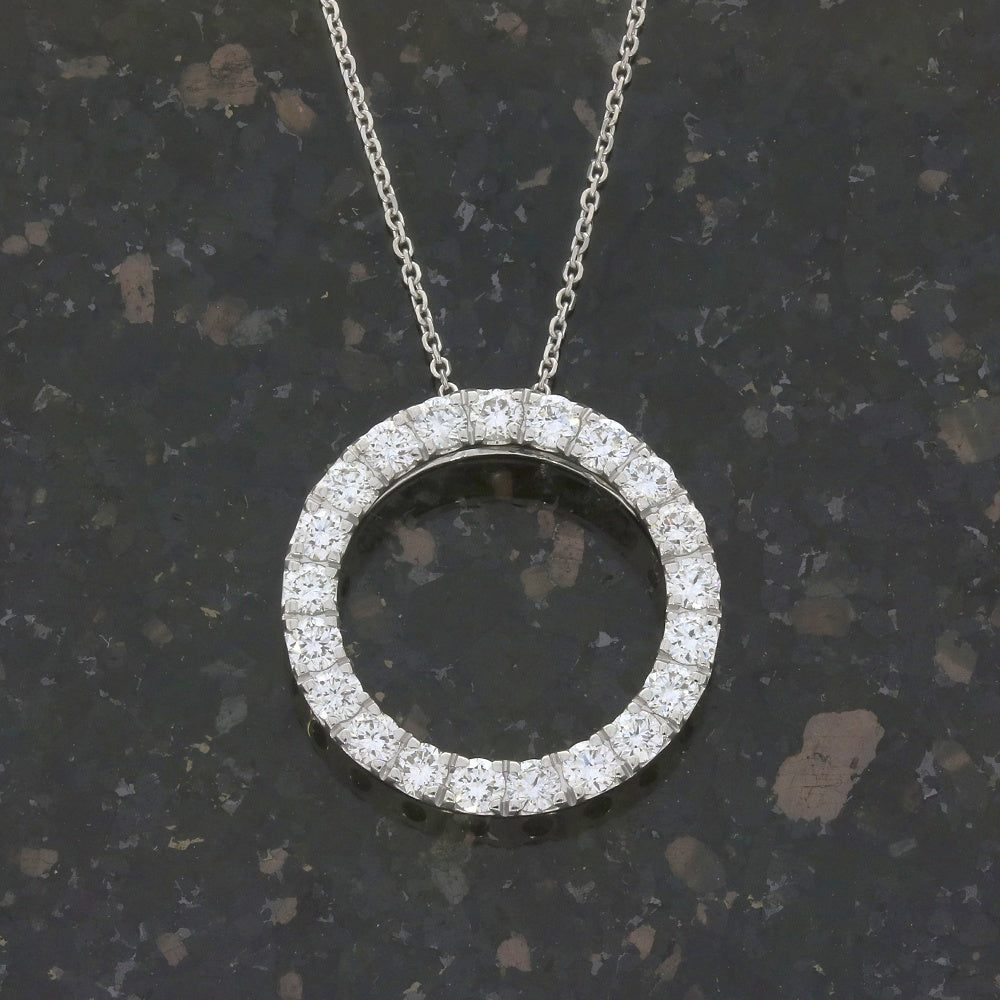 A beautiful Lab-created diamond circular pendant, featuring a 21 uniform brilliant cut Lab-created diamonds, all claw set. This diamond pendant has a total carat weight of 0.96cts, with a colour grade of F, and a clarity VS. Set on a 9ct white gold fine trace chain, that measures 16″-18″, and has a bolt ring fasten.