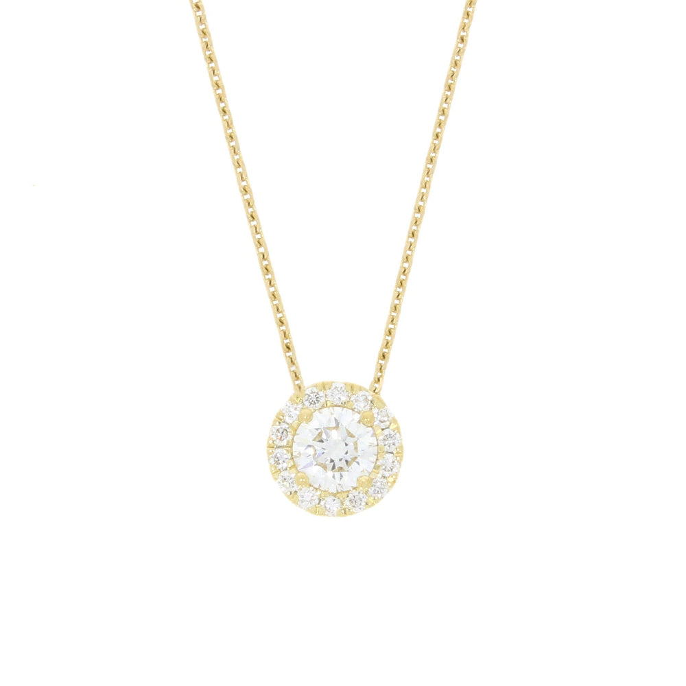 Beautiful Lab-created diamond pendant, featuring a centre brilliant cut diamond, with a halo surround of 14 delicate diamonds, all in claw settings. This diamond pendant has a total carat weight of 0.67cts, with a colour grade of F, and a clarity VS. Set on a 9ct yellow gold fine trace chain, that measures 16″-18″, and has a bolt ring fasten.?