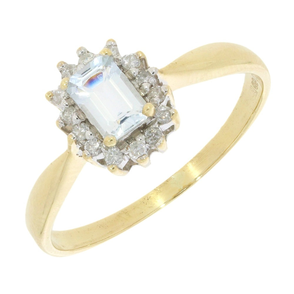 We have for sale a pretty second-hand 9ct yellow gold cluster ring, featuring a centre 6mm x 4mm emerald cut Aquamarine. It has a surround of 14 small round brilliant cut diamonds, totalling 0.15cts. The sparkling white diamonds have a clarity if SI1 and a colour of H. All are claw set.