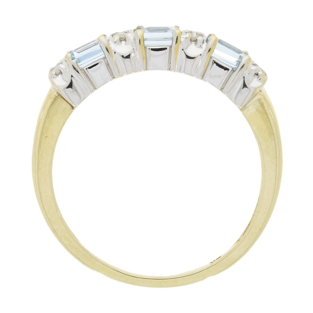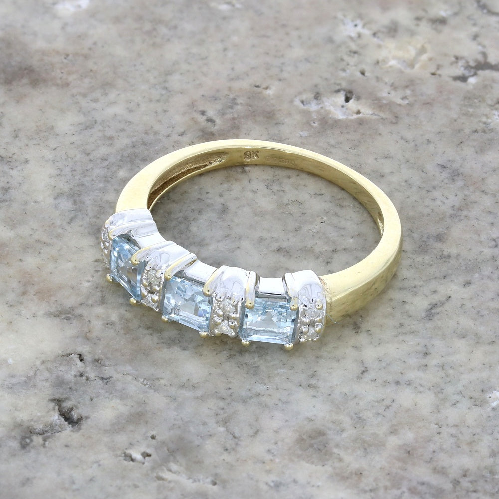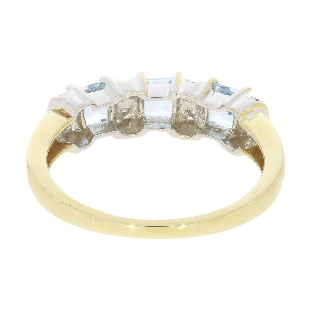 This pretty second-hand eternity style ring is 9ct yellow gold, and features three square princess cut blue topaz stones, with four sets of 2 delicate round brilliant cut diamonds betweem, all in a claw settings. The diamond carat weight is approx. 0.08cts and the diamonds are a colour H, and have a clarity of I1.