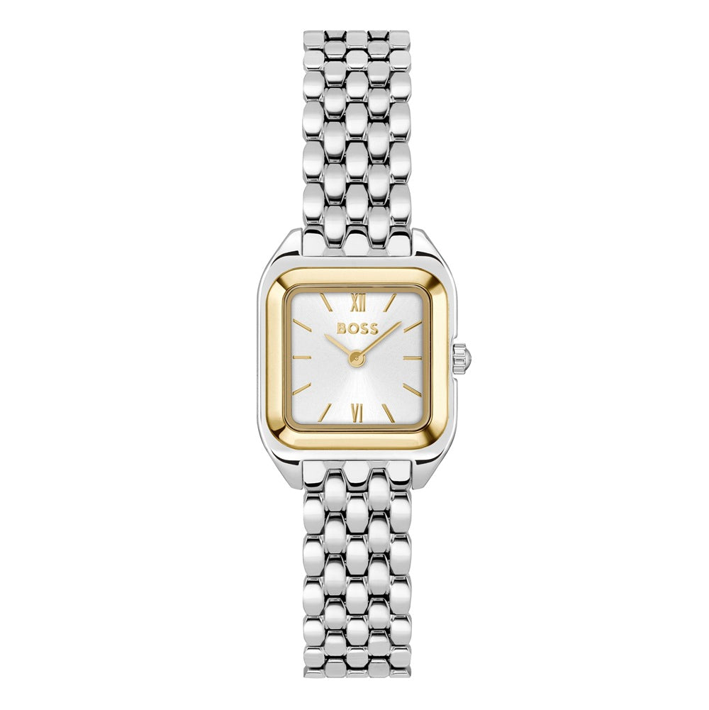 BOSS Watches ladies watch from the Mae Petite collection. Featuring a two tone stainless steel square case, and a white sunray dial. This watch is fitted with a polished stainless steel bracelet, with a push deployment folding clasp.?