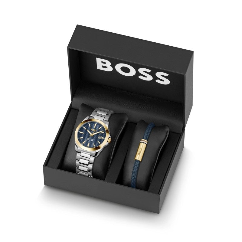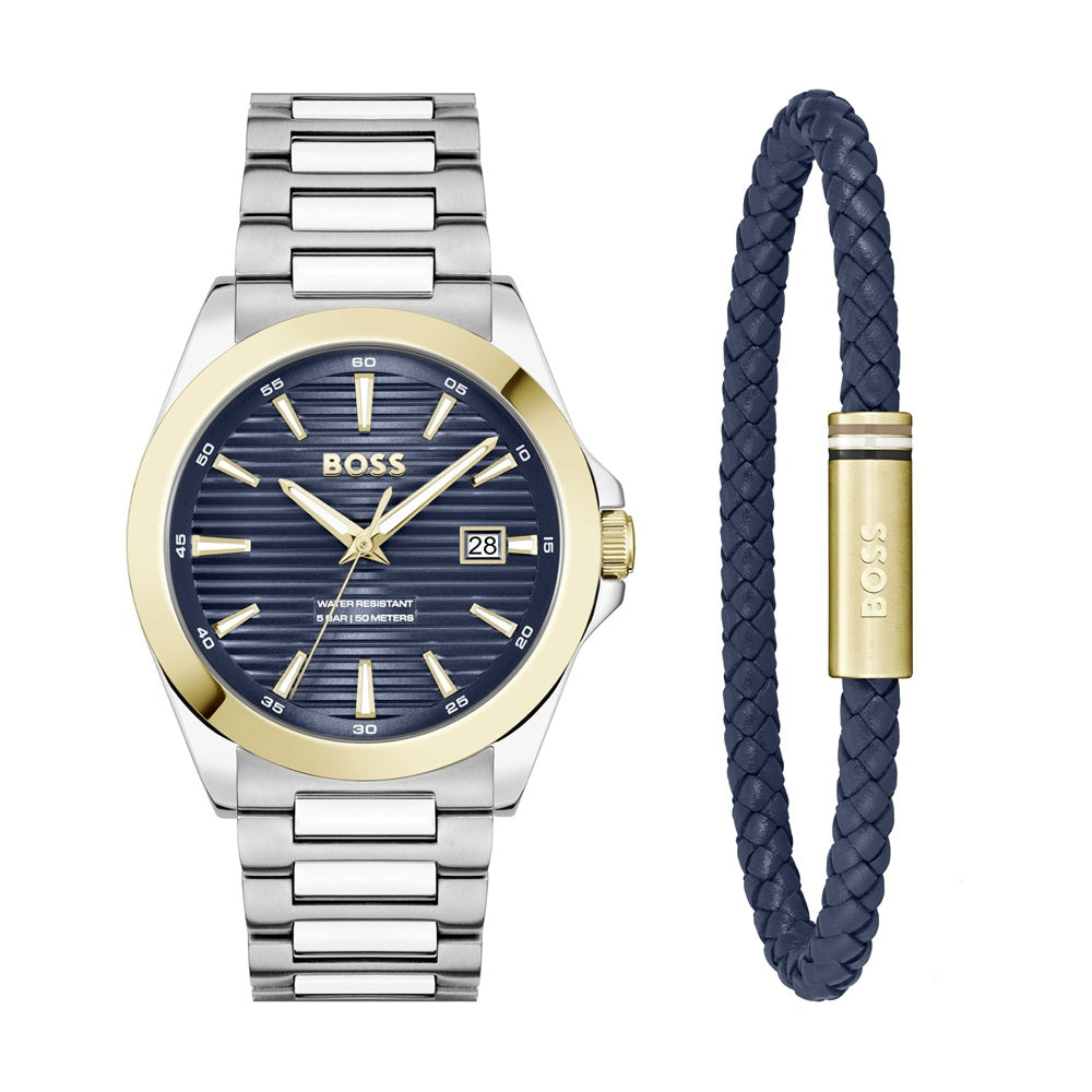 Mens Boss watch and bracelet gift set. Boss strike watch 1514301 features a brushed and polished finish stainless steel case, with a gold plated fixed bezel, a blue textured dial, and a date window positioned at 3 o’clock. Complimented with a brushed and polished stainless steel bracelet, that fastens with a push button deployment clasp.