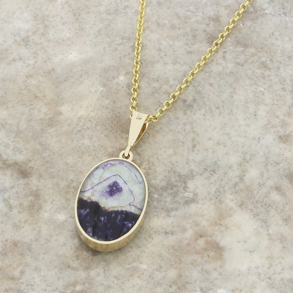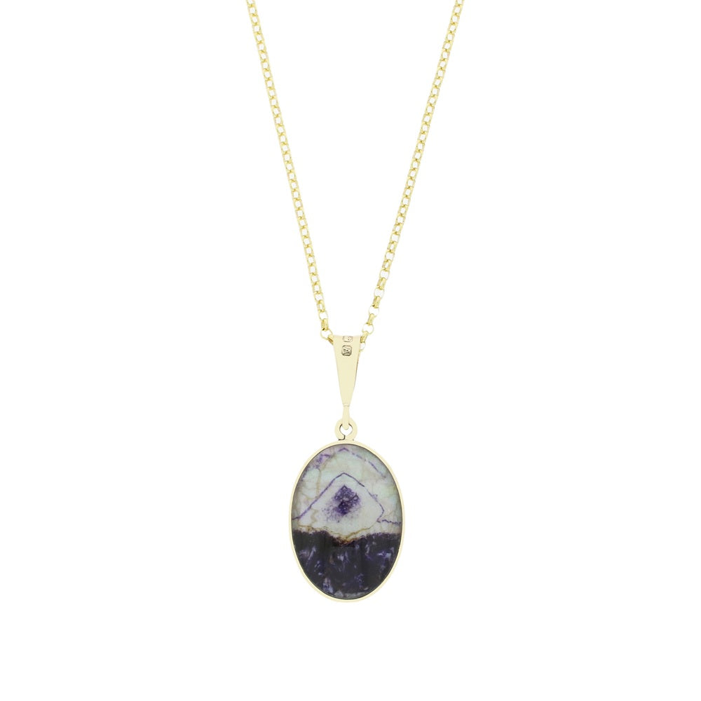 9ct yellow gold Derbyshire Blue John double sided pendant. Beautifully hand crafted in Sheffield, England. In an oval shape, and set with a unique piece of Derbyshire Blue John on the front, and Whitby Jet on the back. Set on a 20″ gold plated sterling silver belcher chain.?