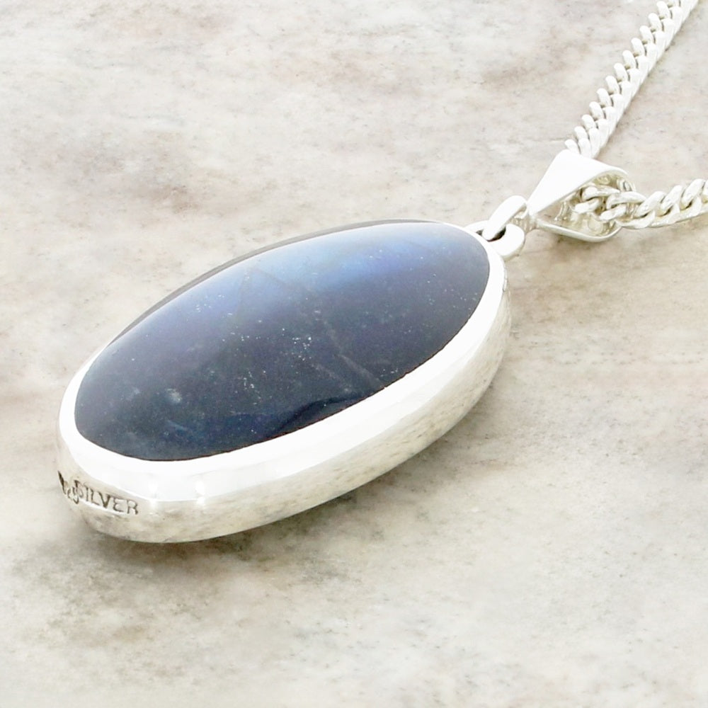 Sterling silver Derbyshire Blue John reversible pendant and chain. Featuring an oval shape pendant, set with a unique piece of Derbyshire blue john on the front, and labradorite on the back. Supplied on an 18″ curb chain, with a bolt ring fasten. Beautifully handcrafted in Sheffield, England.?