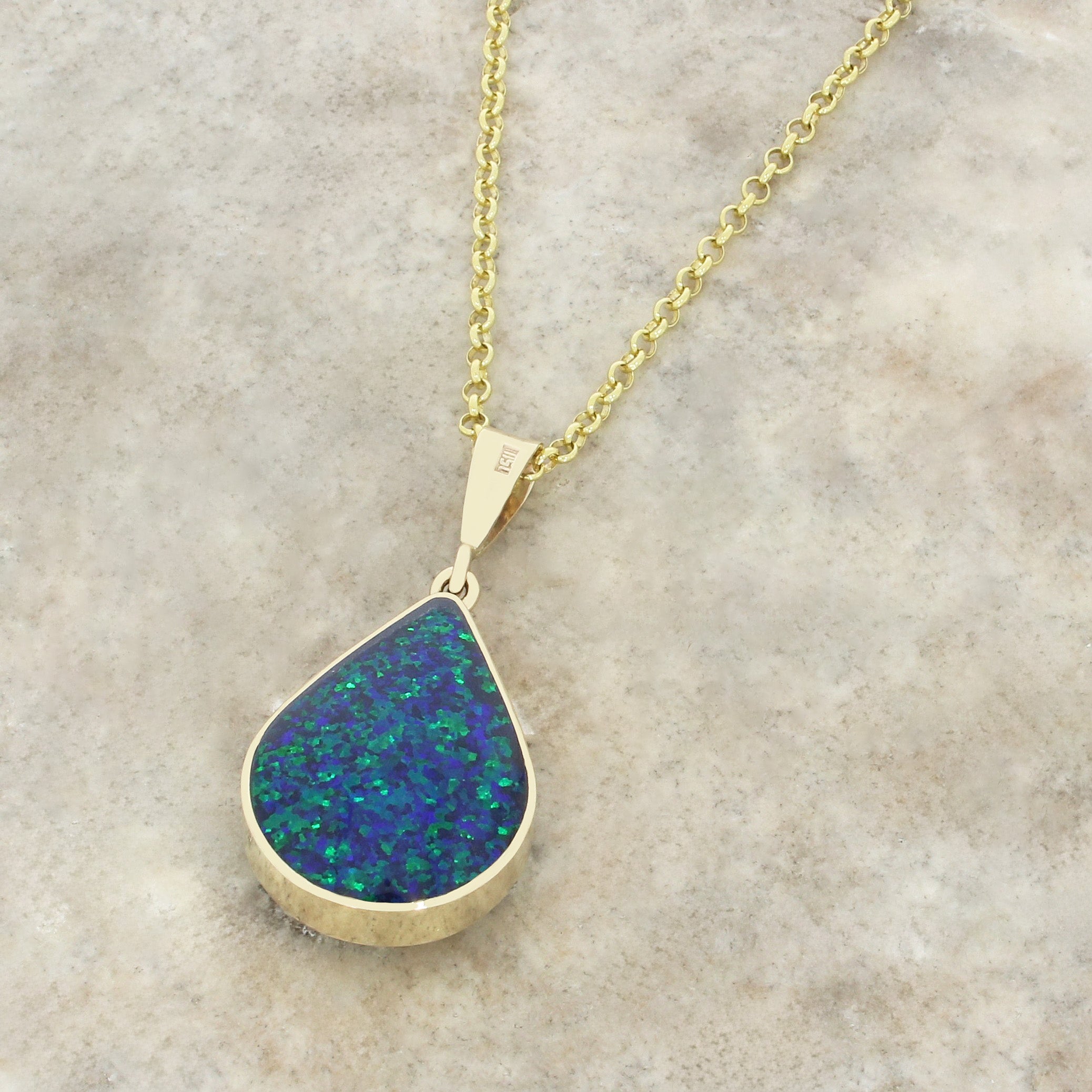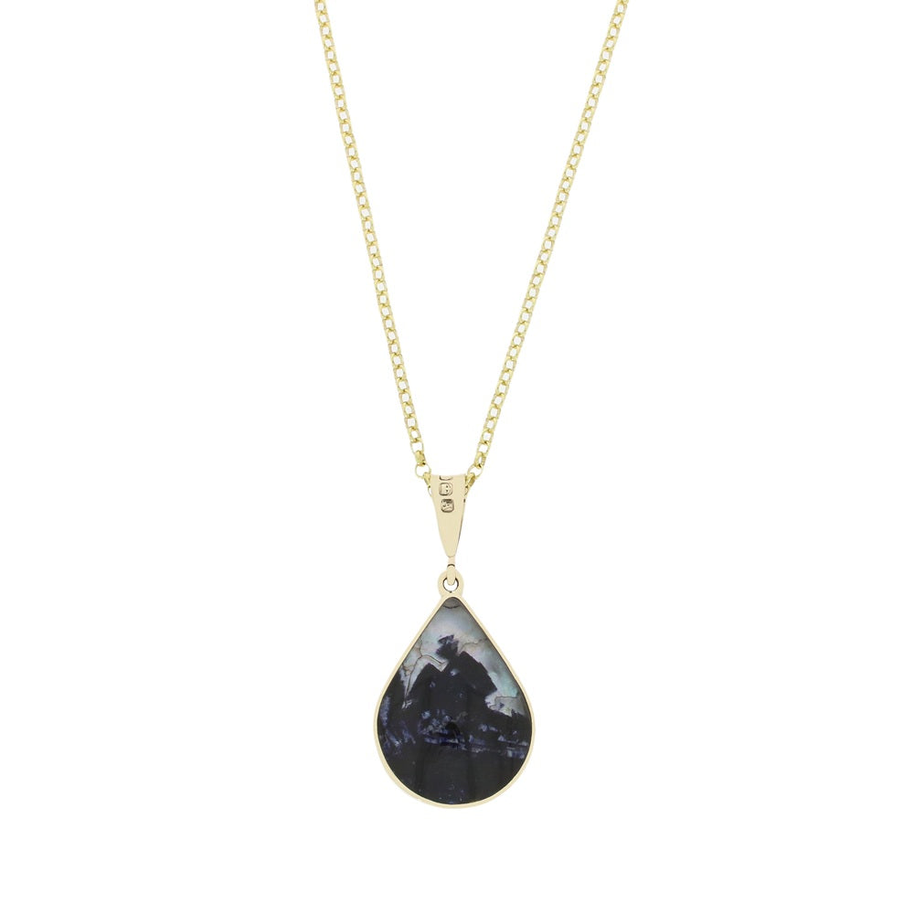 9ct yellow gold Derbyshire Blue John double sided pendant. Beautifully hand crafted in Sheffield, England. In a teardrop shape, and set with a unique piece of Derbyshire Blue John on the front, and seagreen opalique on the back. Set on a 20″ gold plated sterling silver belcher chain.?