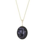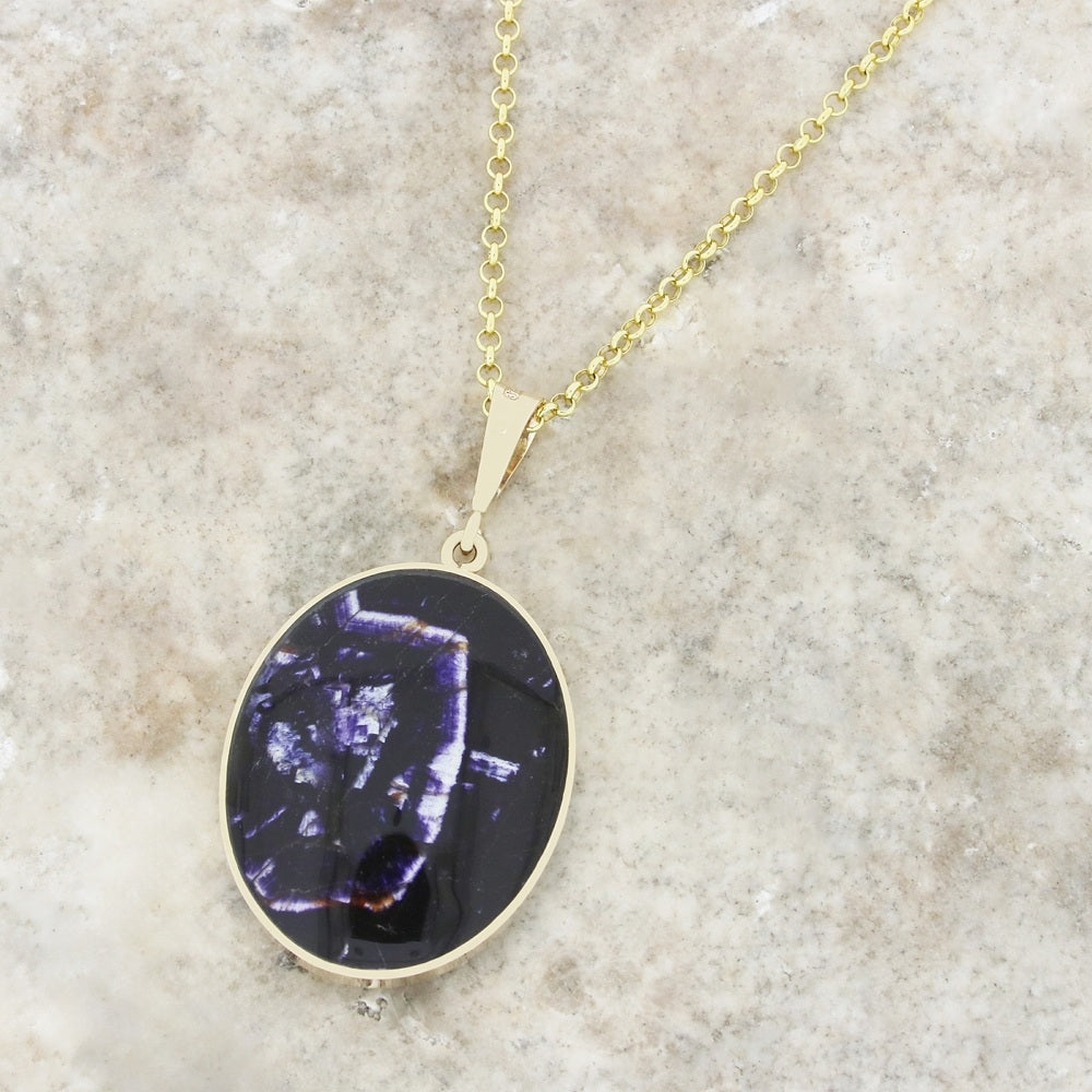 9ct yellow gold Derbyshire Blue John double sided pendant. Beautifully hand crafted in Sheffield, England. In an oval shape, and set with a unique piece of Derbyshire Blue John and tigers eye. Set on a 20″ gold plated sterling silver belcher chain.