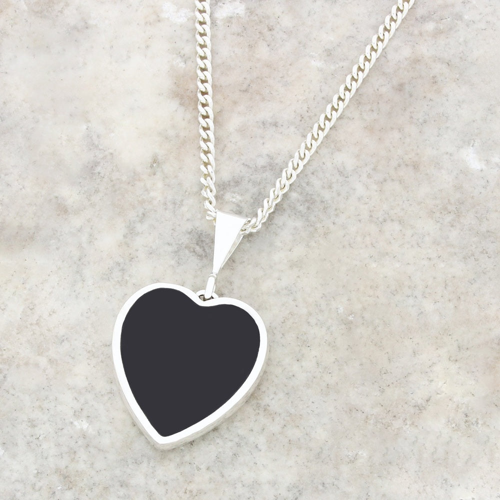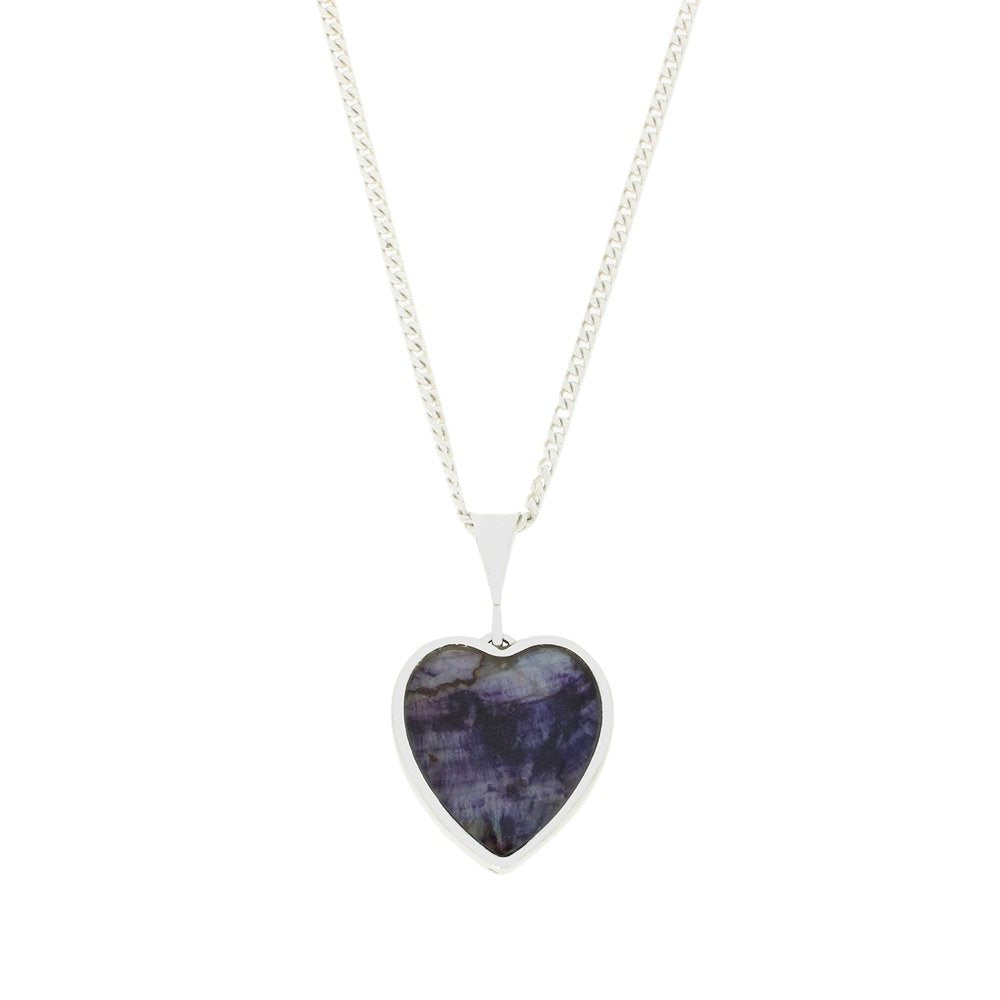 Derbyshire Blue John reversible pendant and chain. Featuring a heart shape, and set with a unique piece of Derbyshire Blue John on the front, and Whitby jet on the back. This pendant is set on a 20″ sterling silver curb chain, with a bolt ring fasten. Beautifully handcrafted in Sheffield, England.