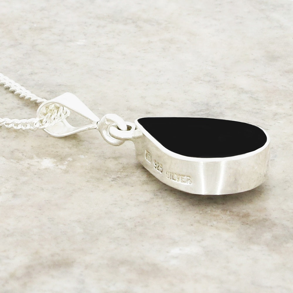 Sterling silver Derbyshire Blue John reversible pendant and chain. Featuring a pear shape pendant, set with a unique piece of Derbyshire blue john on the front, and whitby jet back. Supplied on an 18″ curb chain, with a bolt ring fasten. Beautifully handcrafted in Sheffield, England.?