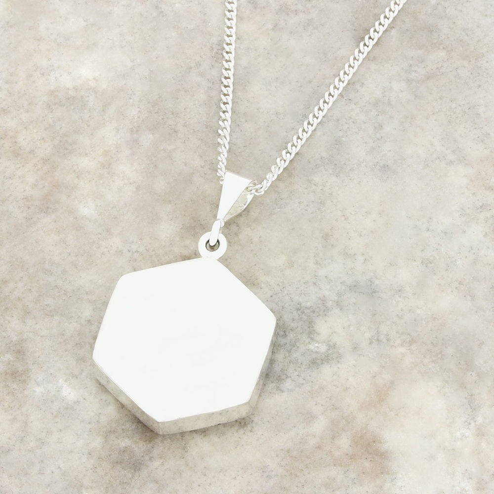 Sterling silver Derbyshire Blue John pendant and chain. Featuring a hexagonal shape pendant, set with a unique piece of Derbyshire blue john on the front, and a solid silver back. Supplied on an 18″ curb chain, with a bolt ring fasten. Beautifully handcrafted in Sheffield, England.?