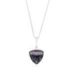 Sterling silver Derbyshire Blue John pendant and chain. Featuring a shield shape pendant, set with a unique piece of Derbyshire blue john on the front, and a solid silver back. Supplied on an 18″ curb chain, with a bolt ring fasten. Beautifully handcrafted in Sheffield, England.?