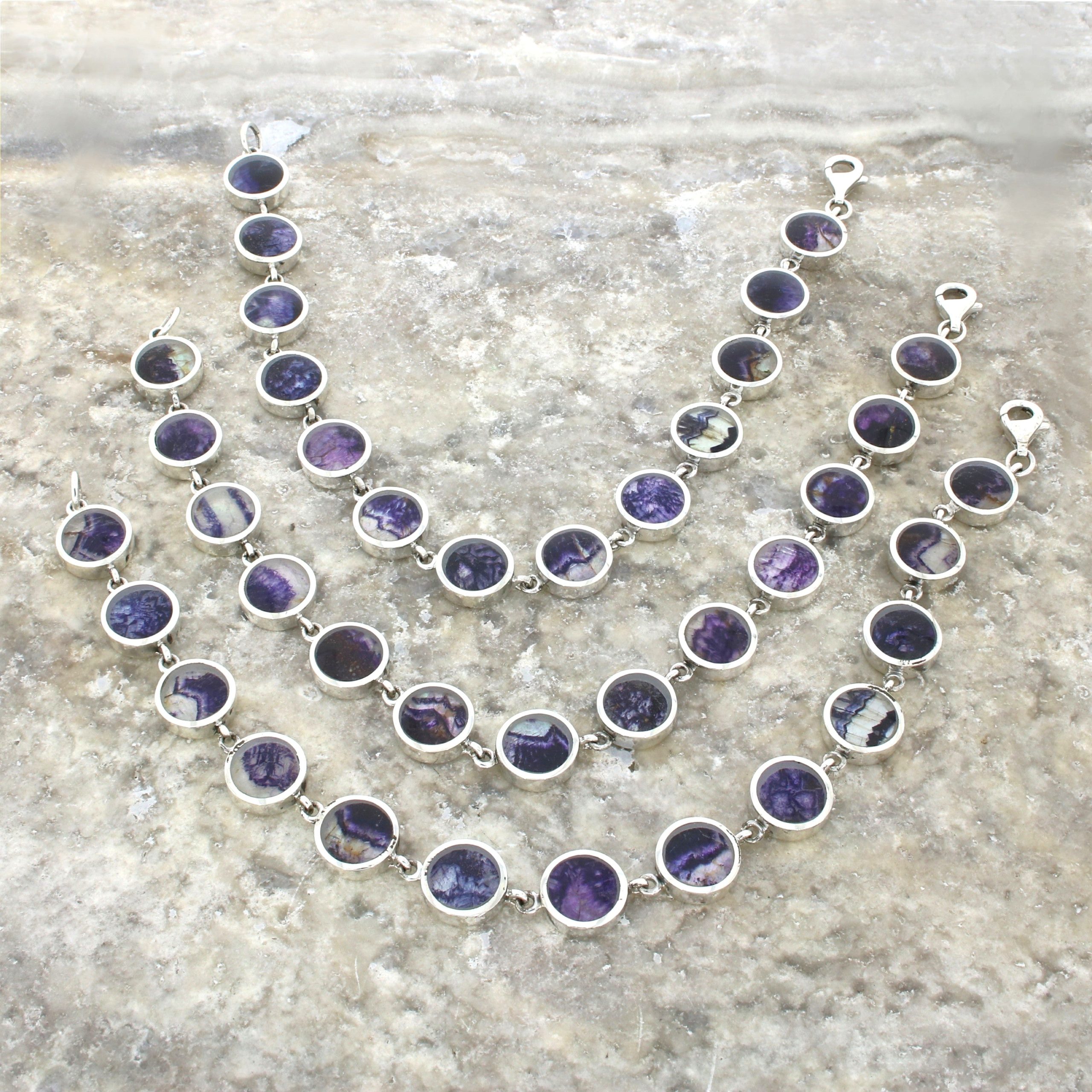 We have for sale a simply stunning sterling silver Blue John bracelet. They are beautifully hand crafted in Sheffield, England. These elegant bracelets features 13 round links, each set with a totally unique piece of Blue John. It measures approx. 20.5cm (including fasten) and fastens with a lobster clasp.?