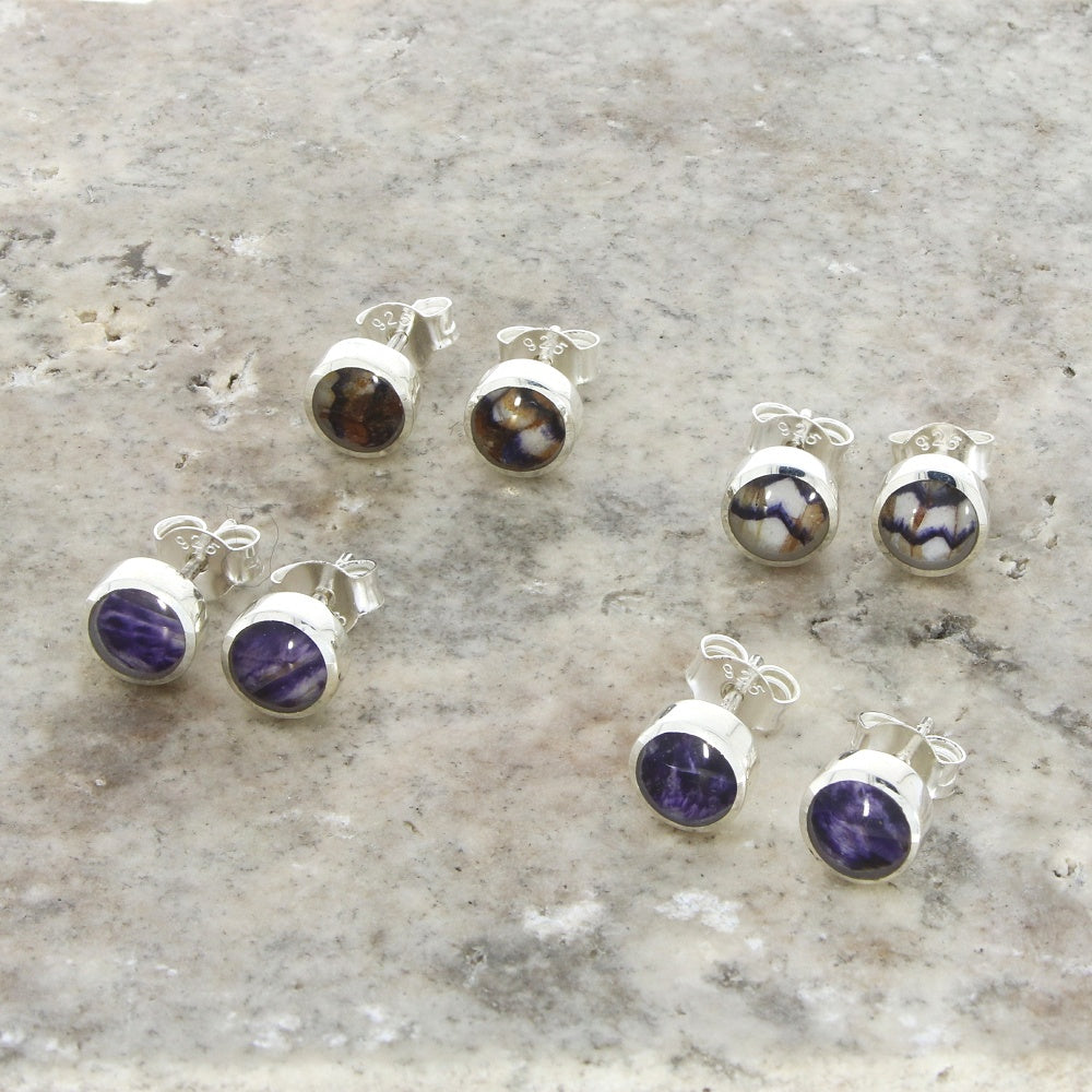 Shop our beautiful Derbyshire Blue John stud earrings, featuring a simple round design, with a post and butterfly fasten. Uniquely handcrafted in Sheffield.?