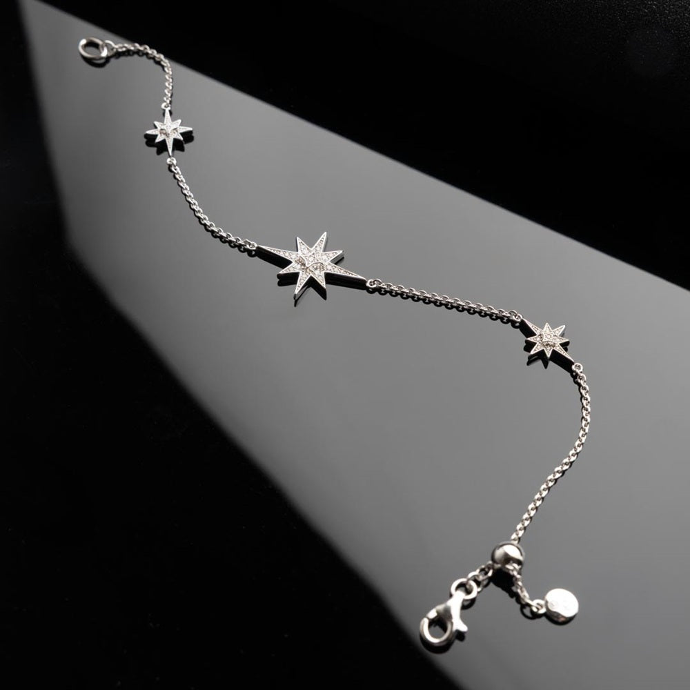 This delicate bracelet features three eight-pointed North Starburst radiating sparkle at every point and centre, connected along a fine chain that fastens with a sterling silver lobster clasp.?