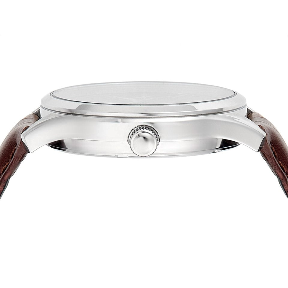 Complimented with a brown leather strap that fastens with a polished stainless steel buckle.
