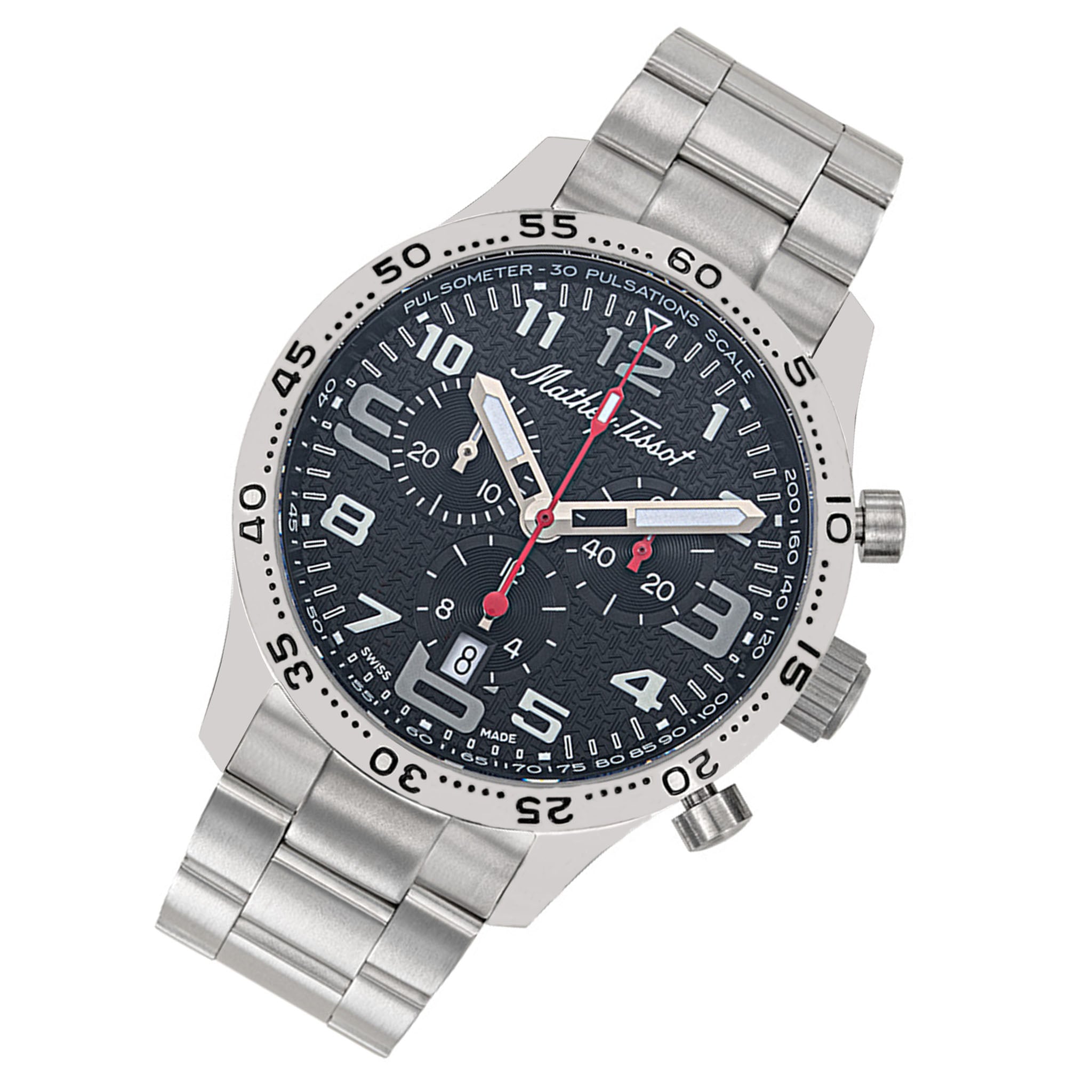 Experience the precision of a Quartz Chrono Ronda 5030D movement with the Mathey-Tissot Silver Titanium Black Dial Chronograph Men’s Watch. Measuring 42mm in case diameter and 12mm in case thickness, this watch is made of durable titanium and features a scratch-resistant sapphire crystal. The sleek black dial is contrasted by a silver titanium band, 20mm in width and 18mm in length. With a water resistance of 5 ATM and a deployant clasp, this watch is perfect for everyday wear.