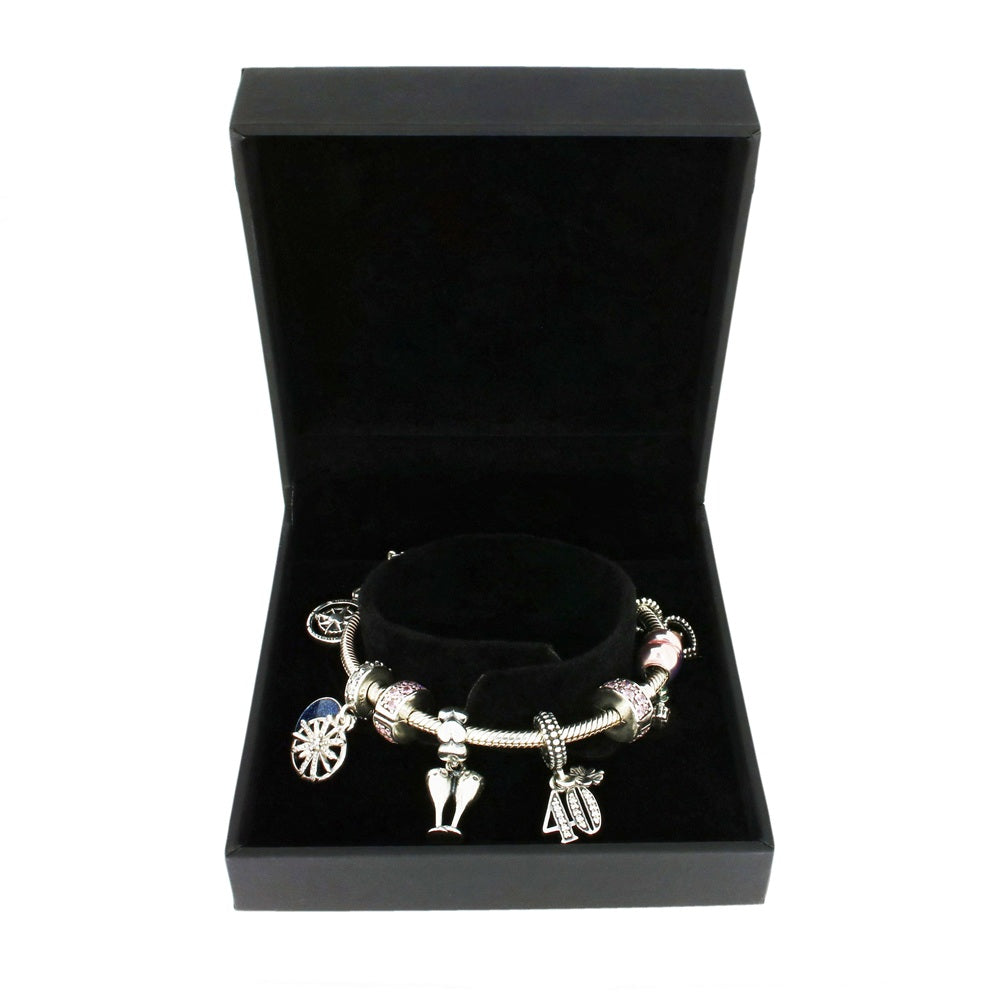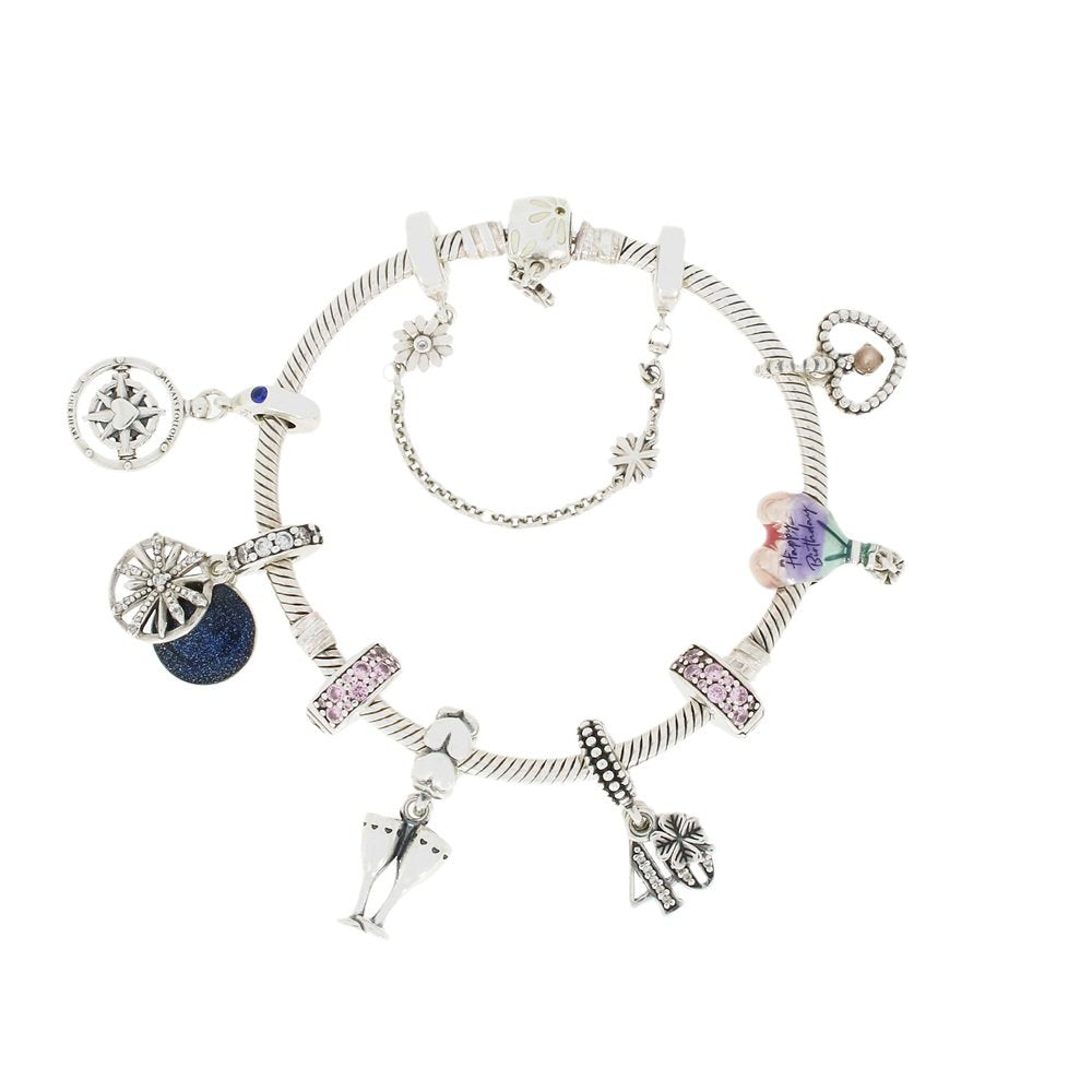 We have for sale a beautiful pre owned pandora charm bracelet. This ladies sterling silver snake chain bracelet, features a barrel clasp, for a secure fit, and comes supplied with 6 sterling silver pandora charms, 2 sparkly safety charms, and a daisy safety chain fasten. The total bracelet length is approx. 17.5cm and it weighs 40.6 grams (including charms).