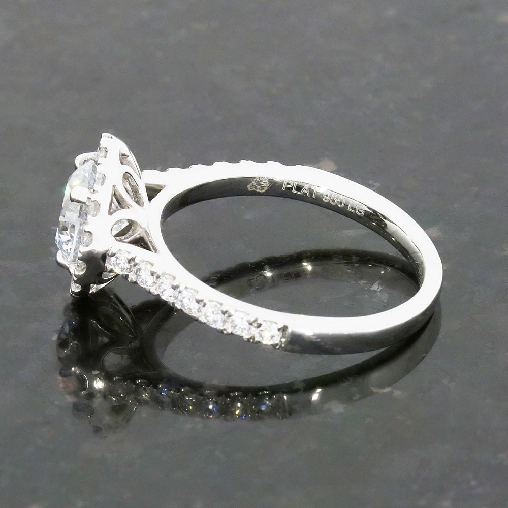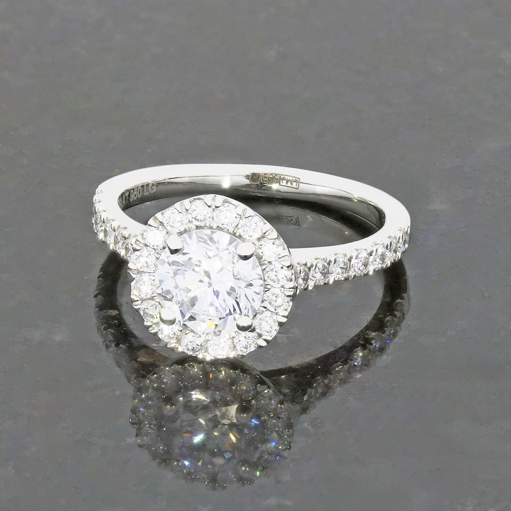 Stunning platinum lab-grown Diamond halo ring. Featuring a centre 1.18ct diamond, with a surround of 0.55ct delicate diamonds, and further diamonds set in the shoulders, all in claw-settings. The total diamond carat weight for this ring is 1.73cts, with a diamond colour of F, and diamond clarity of VS.?