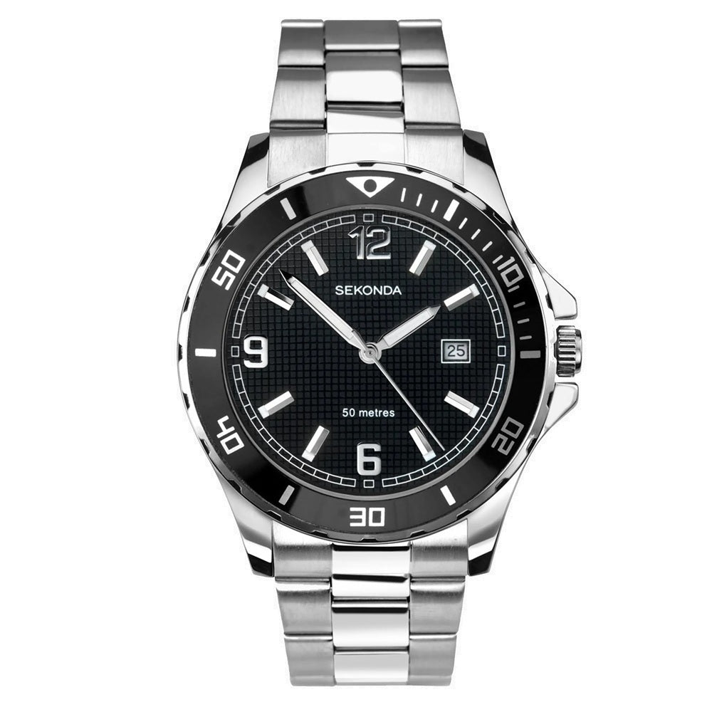 Sekonda 1513 men’s watch has a round polished silver tone ionic plated case with fixed black colour bezel, a stainless steel case back and a textured black colour dial.