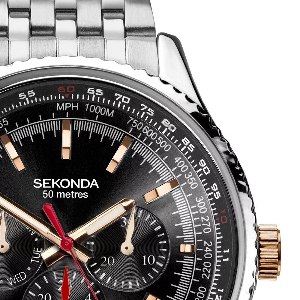 This classic aviator style mens Sekonda pilot watch features a black and rose gold dial, with a fixed chapter ring. The dial holds 3 subsidiary dials for the 24 hour, day and date features.?