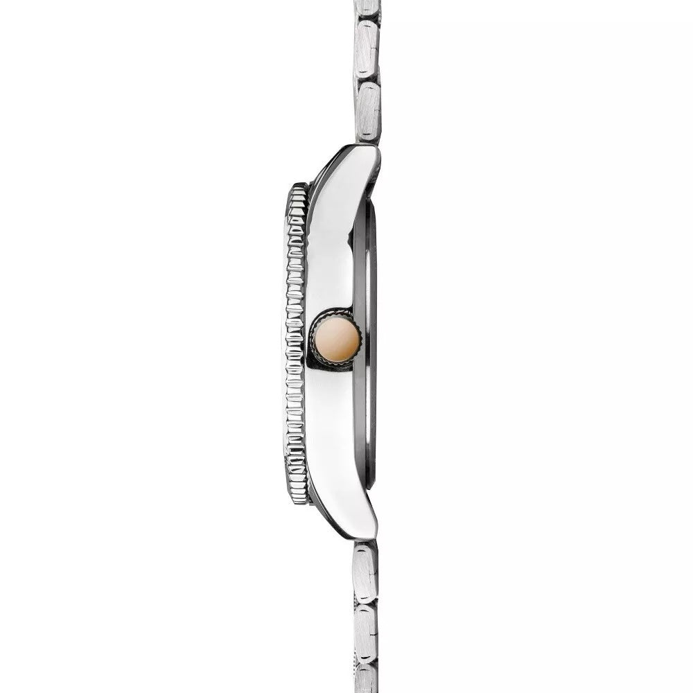 Fitted with a stylish stainless steel brushed and polished bracelet with a spring loaded folding clasp. Classic aviation design in an elegant wristwatch