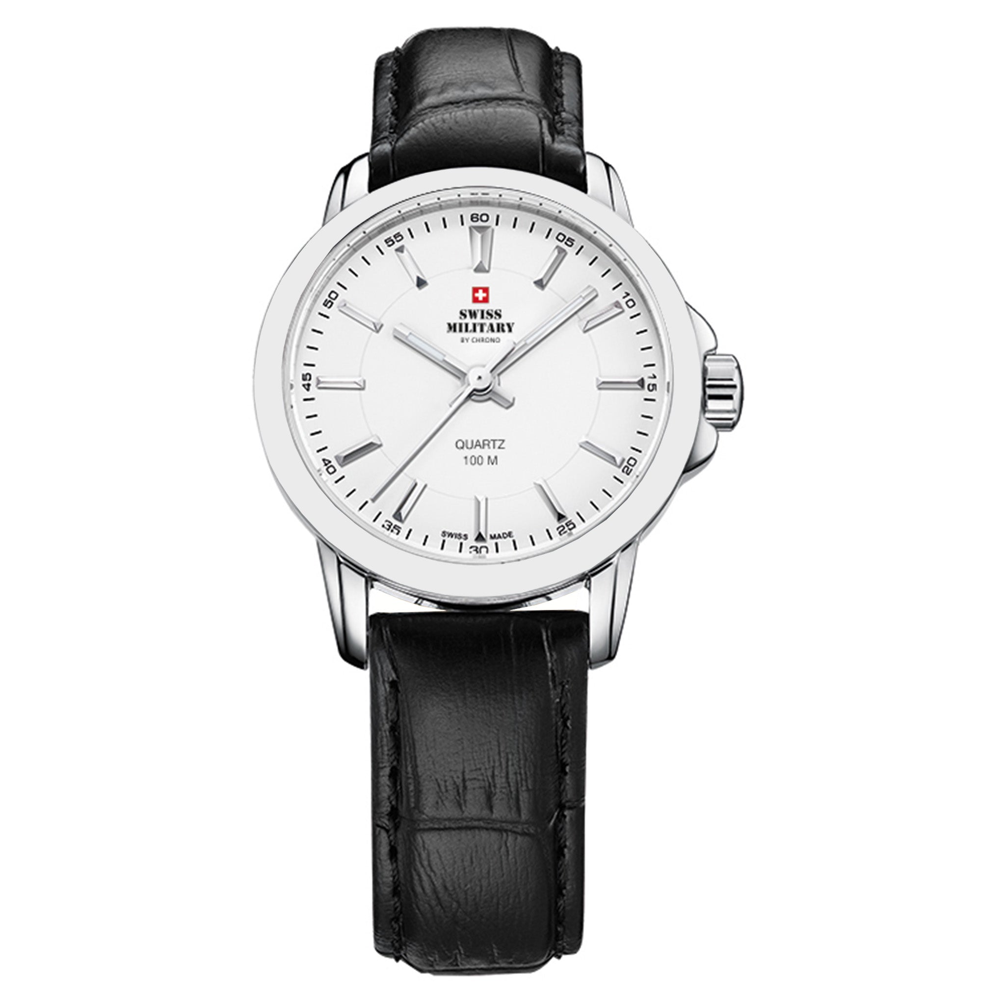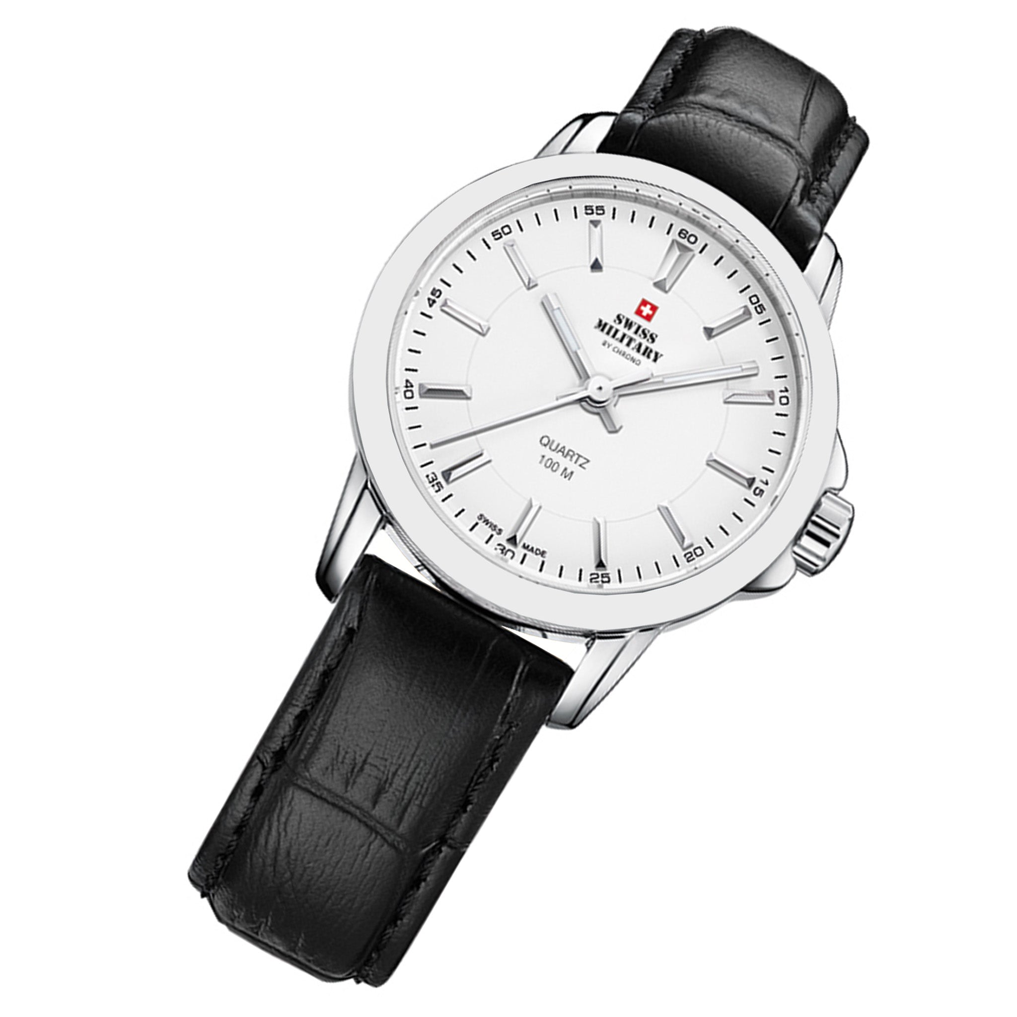 This Women’s Swiss Military watch features a precise 3-hand quartz movement within a 28mm silver stainless steel case, safeguarded by scratch-resistant K1 mineral glass with sapphire coating. Its crisp white dial is complemented by a sleek black leather band, secured with a pin buckle clasp. With an 8mm case thickness and 10 ATM water resistance, this timepiece blends sophistication with dependable everyday performance.