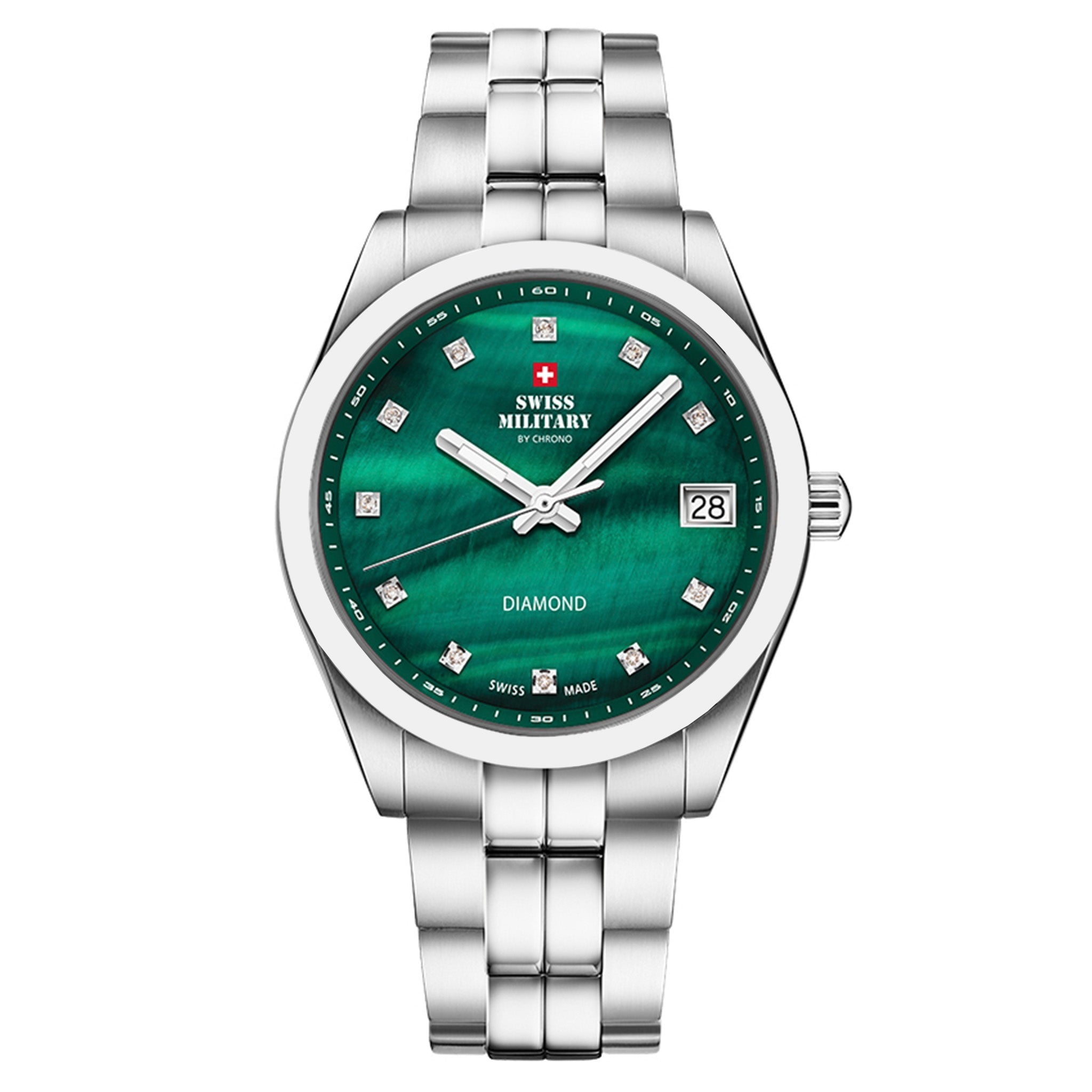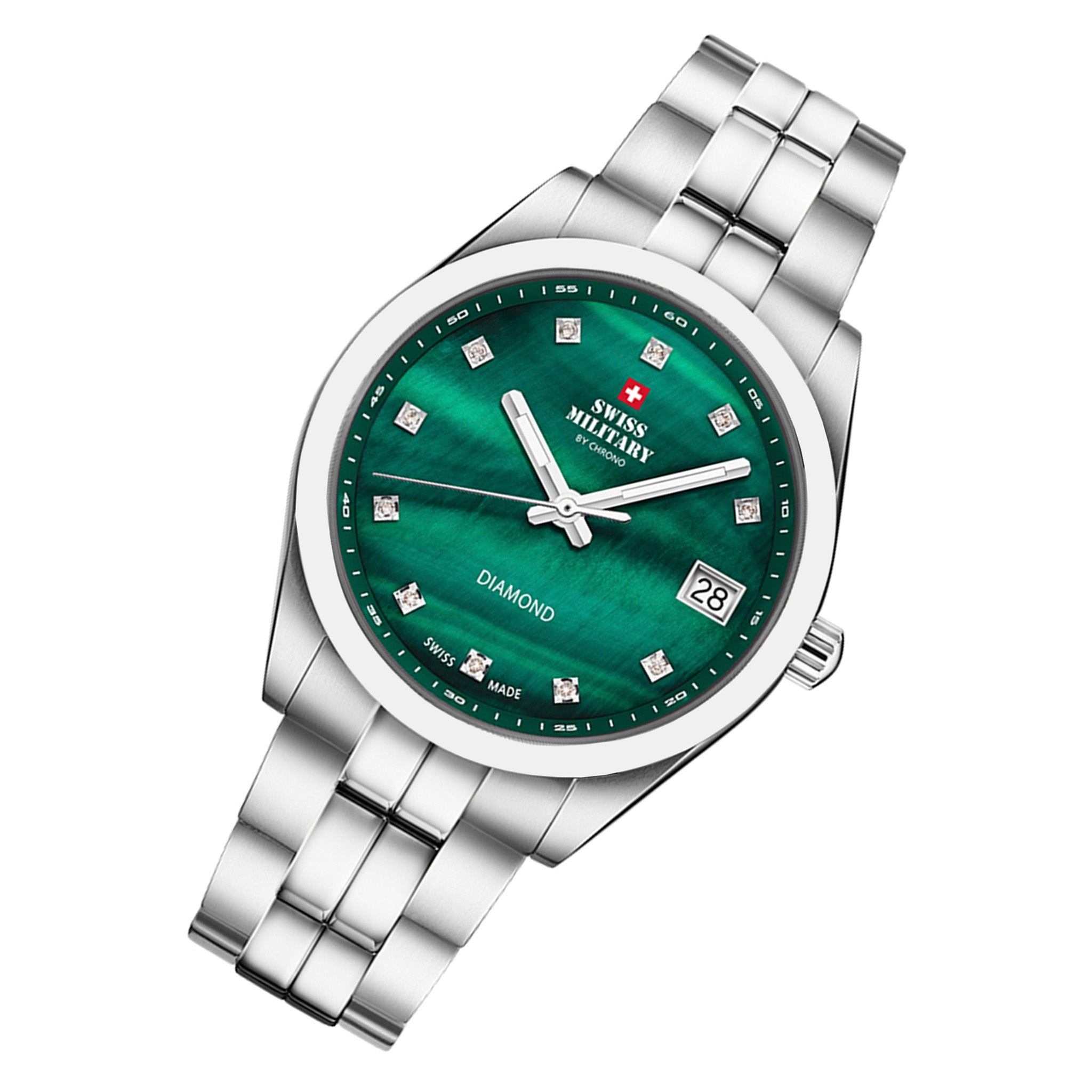 This Swiss Military women’s watch showcases a reliable 3-hand quartz movement within a 35mm stainless steel case. The steel-colored case complements the vibrant green dial adorned with diamonds for a refined look. The stainless steel band, finished in steel, secures comfortably with a push-button butterfly clasp. Water-resistant up to 10 ATM, this timepiece offers both elegance and robust performance for everyday use.